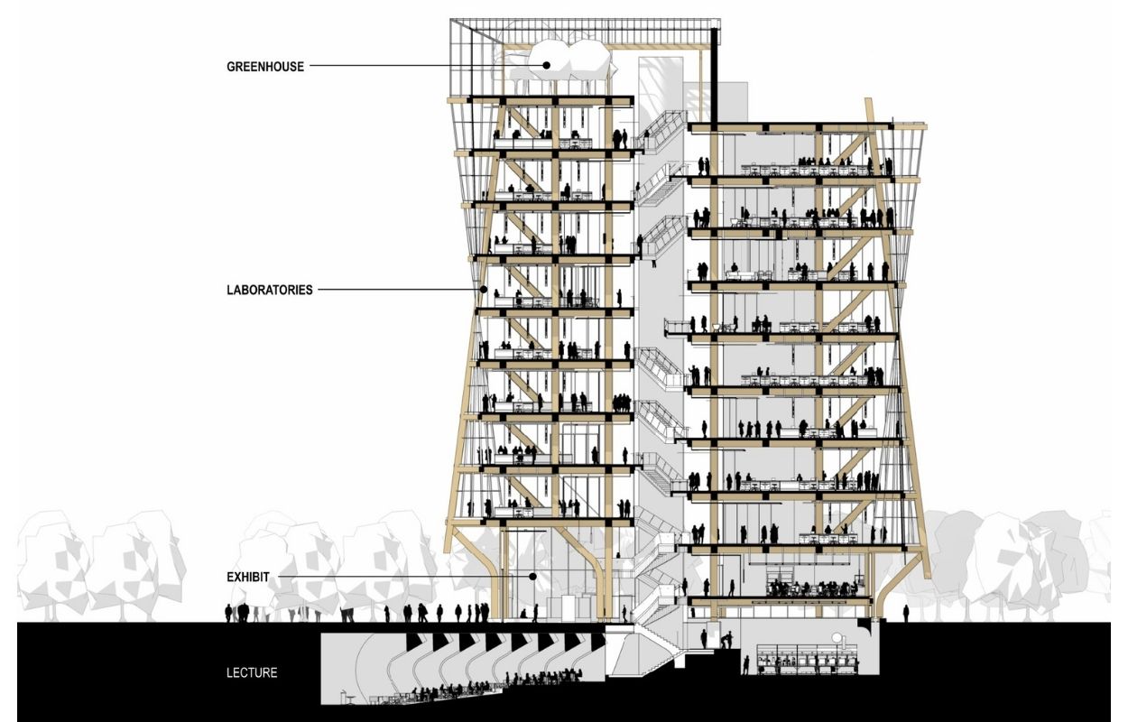 This speculative ten-story lab reimagines how biotechnology and architecture might coexist. Designed as a continuous public platform of cascading floors, the structure supports visibility, collaboration, and discovery. Mass timber replaces conventional materials to showcase the potential of engineered biology — merging strength, sustainability, and elegance. Inside, biophilic design principles enhance the daily experience for researchers, promoting wellbeing and focus. By combining cutting-edge science with a natural material palette, the project proposes a new model for institutional space: open, warm, and human-centered.
