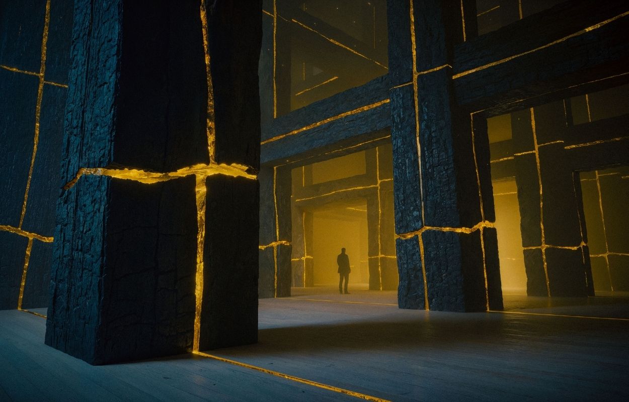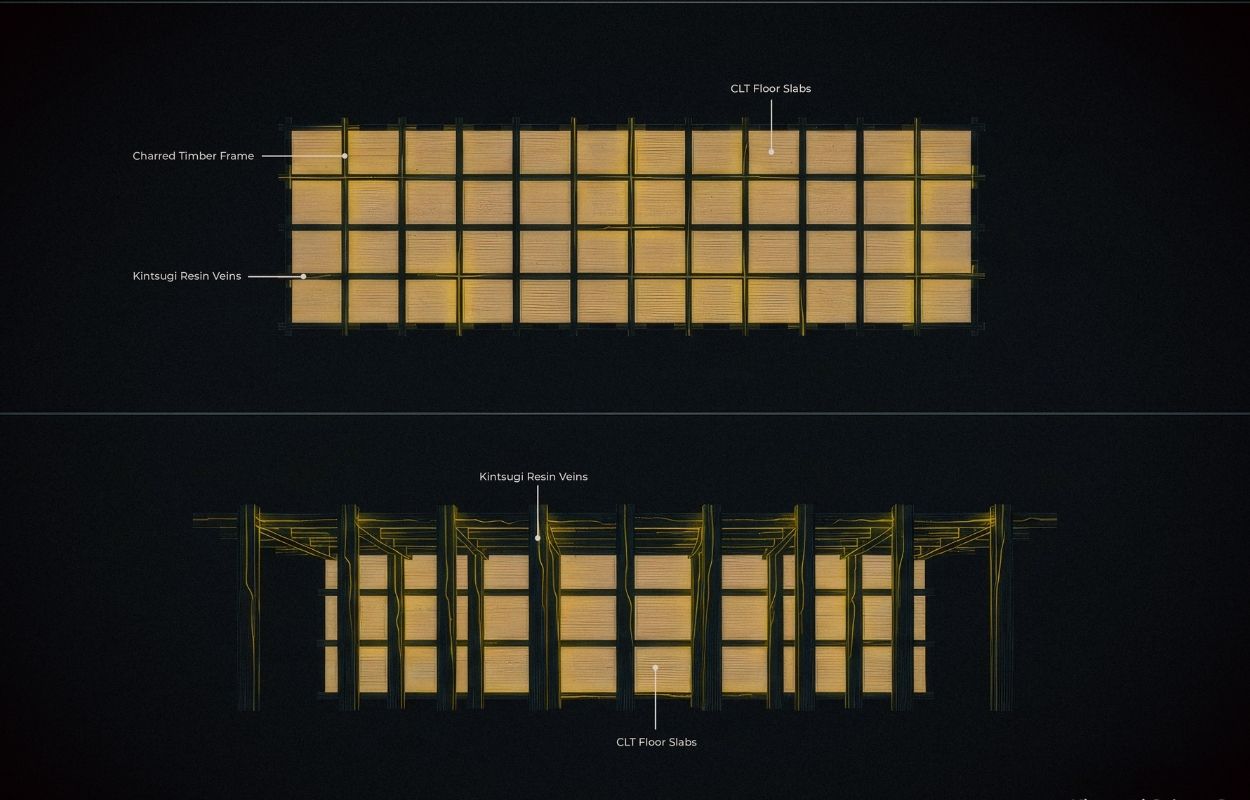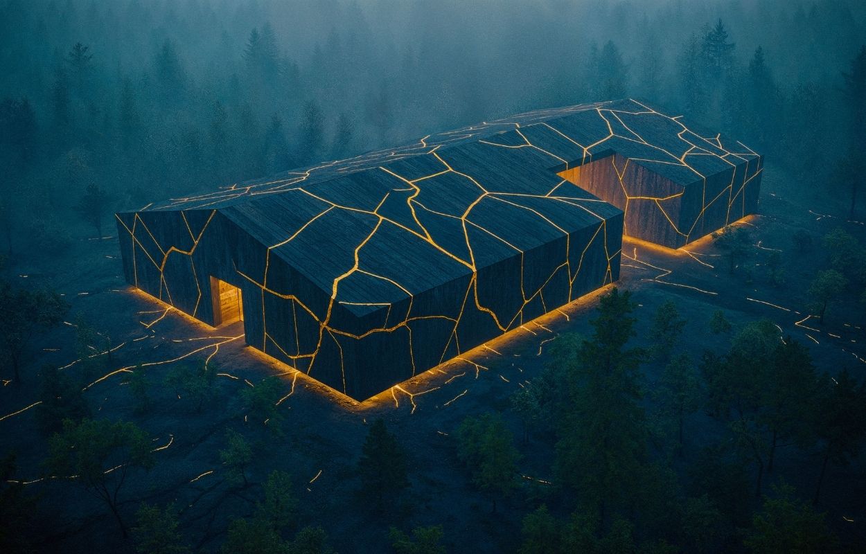 Rather than pursuing technological spectacle, Digital Kintsugi offers a poetic vision of timber as a medium of healing. The proposal reuses damaged, charred timber from climate disasters to form a structural core — scars made visible rather than erased. Inspired by the Japanese philosophy of Kintsugi, where broken pottery is repaired with gold, this building fills its cracks with glowing bio-resin veins, turning trauma into light. A minimalist, windowless space becomes a meditative interior where light emanates from within, creating a deeply symbolic architecture of restoration. More than a structure, this project offers a contemplative space where nature’s past is honoured, and its future reimagined.